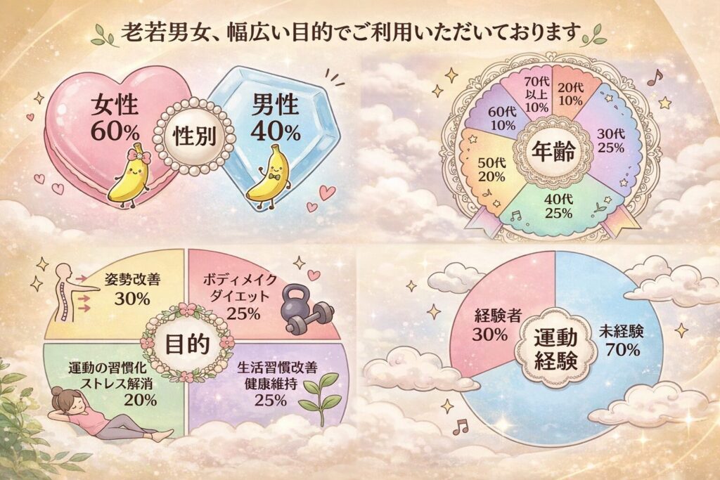 性別・年齢問わず、たくさんの方にご利用いただいており、もともとジム利用が初めての方7割。運動や体力に自信がない方も大歓迎です。