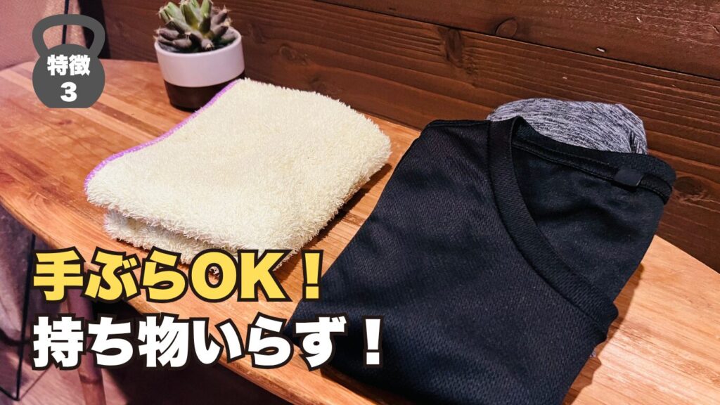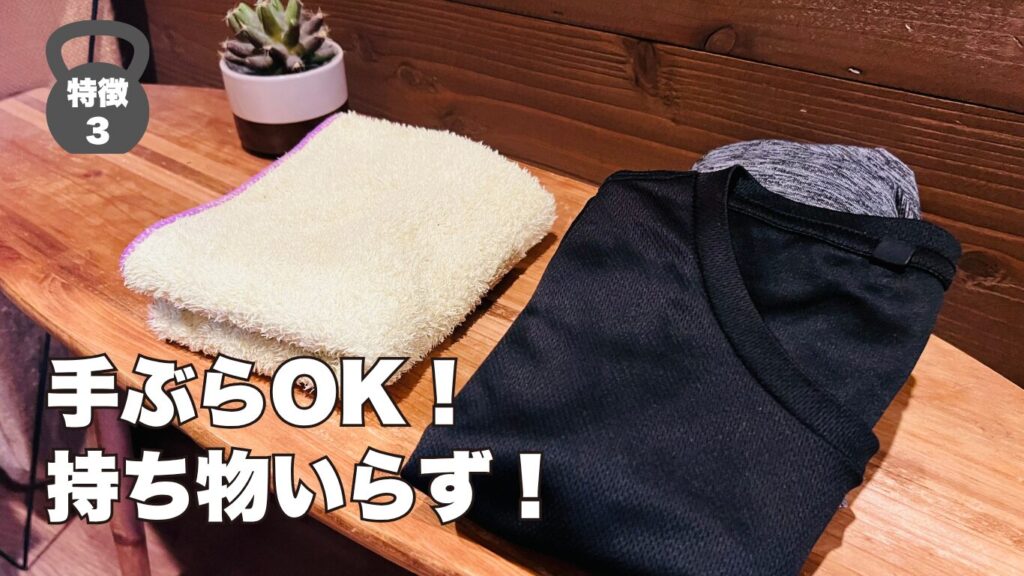 スポーツウェア(Tシャツ・ハーフパンツ)、シューズを用意しており、無料レンタルで手ぶら通いできます。裸足、靴下でのトレーニングも可能です。
