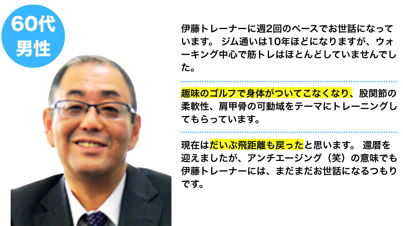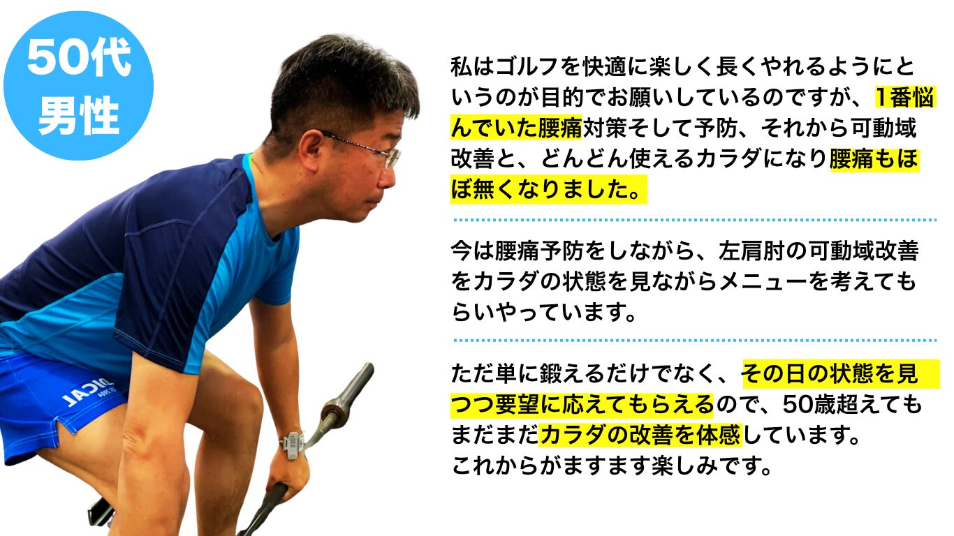 肩こりや腰痛の予防改善、ゴルフの飛距離を伸ばしたい方、階段の昇り降りをスムーズにしたい方など、ひとりひとりの目標に合ったセッションをご提案します。