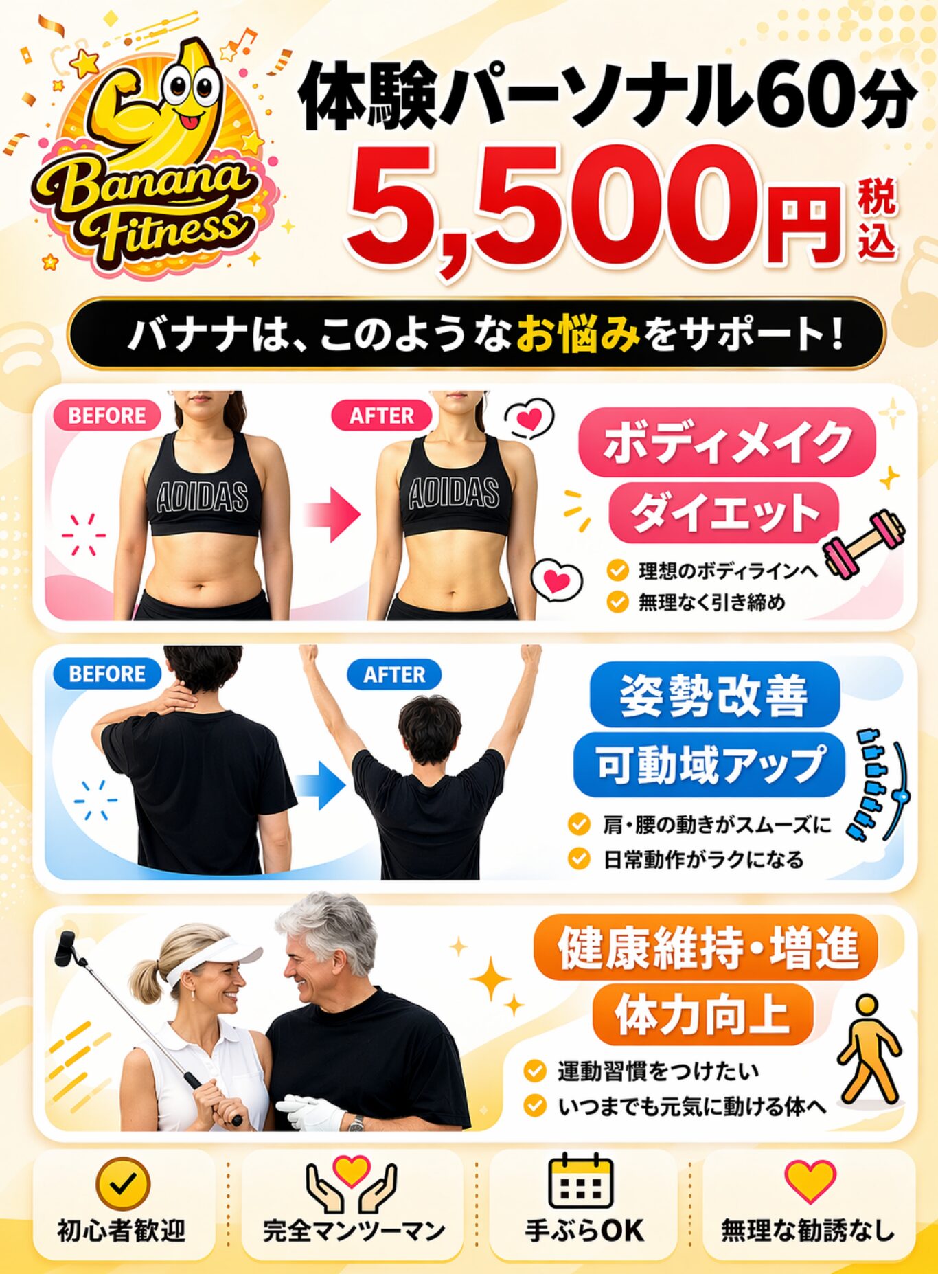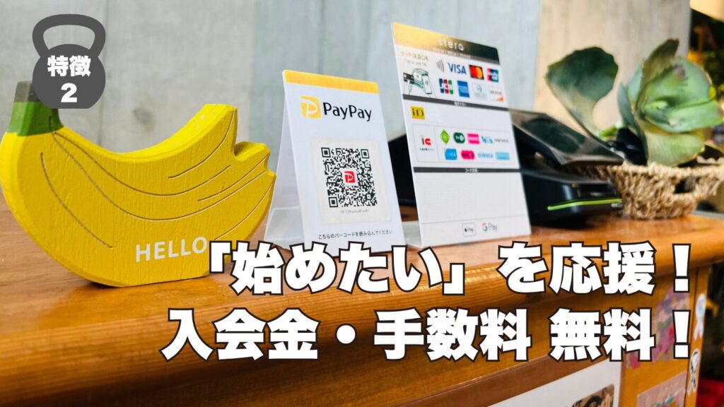 バナナフィットネスは、通年で入会金・事務手数料¥0。また、無理矢理な営業や勧誘はございません。サプリなどの物販も一切やらないポリシーで運営しています。