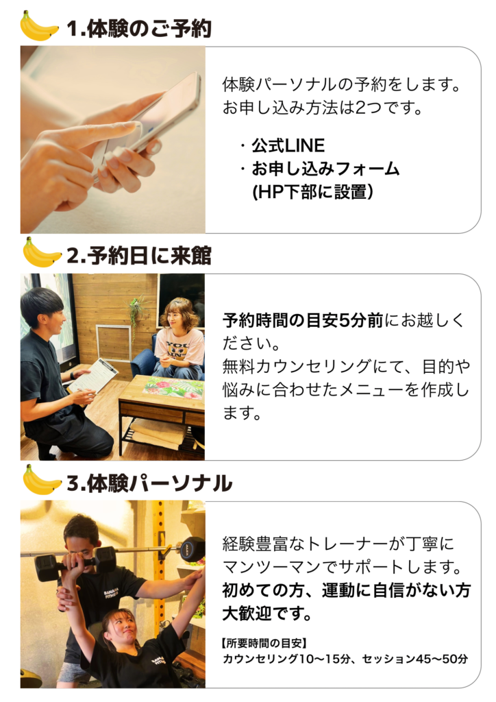 横浜反町パーソナルジムBANANA FITNESS HPページ内に設置してある「公式LINE」「お問い合わせフォーム」からお申し込みください。